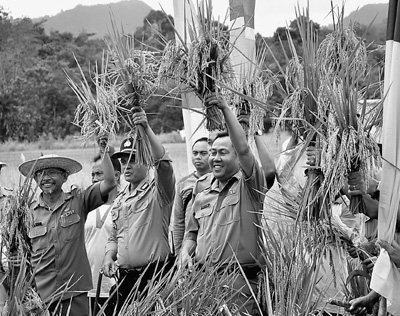 2015-06-12當(dāng)?shù)卣賳T和村民高舉剛剛收割的水稻,興奮地贊不絕口。 印度尼西亞西加里曼丹省山口洋市郊,稻田里一片喜人的綠色。中國…